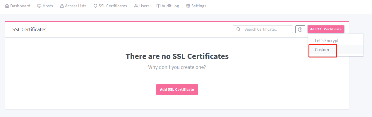 2. 点击右上角 Add SSL Certificate > Custom,打开上传证书界面