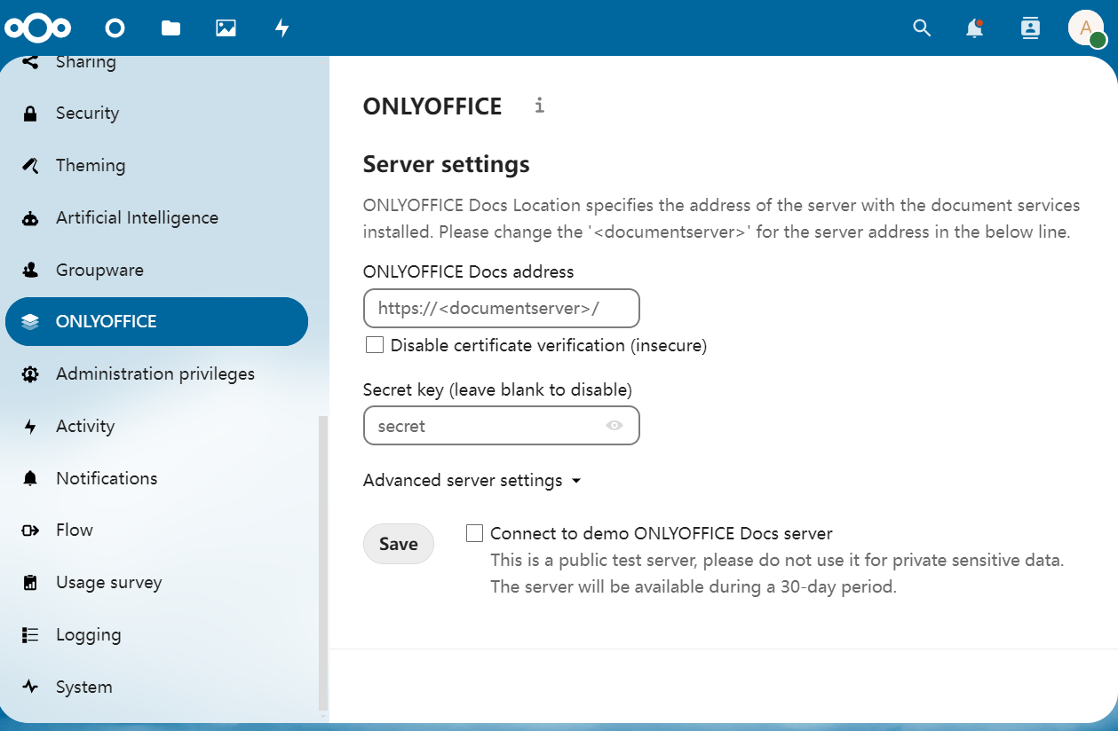 In the Nextcloud console, click the top-right gear icon, select Administration Settings, and find ONLYOFFICE settings. Follow the Integration Guide for ONLYOFFICE.