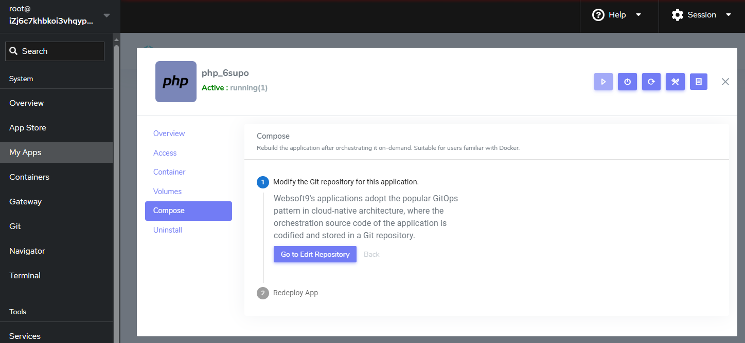 Login to Websoft9 Console, go to the Compose tab page of appli manage from My Apps
